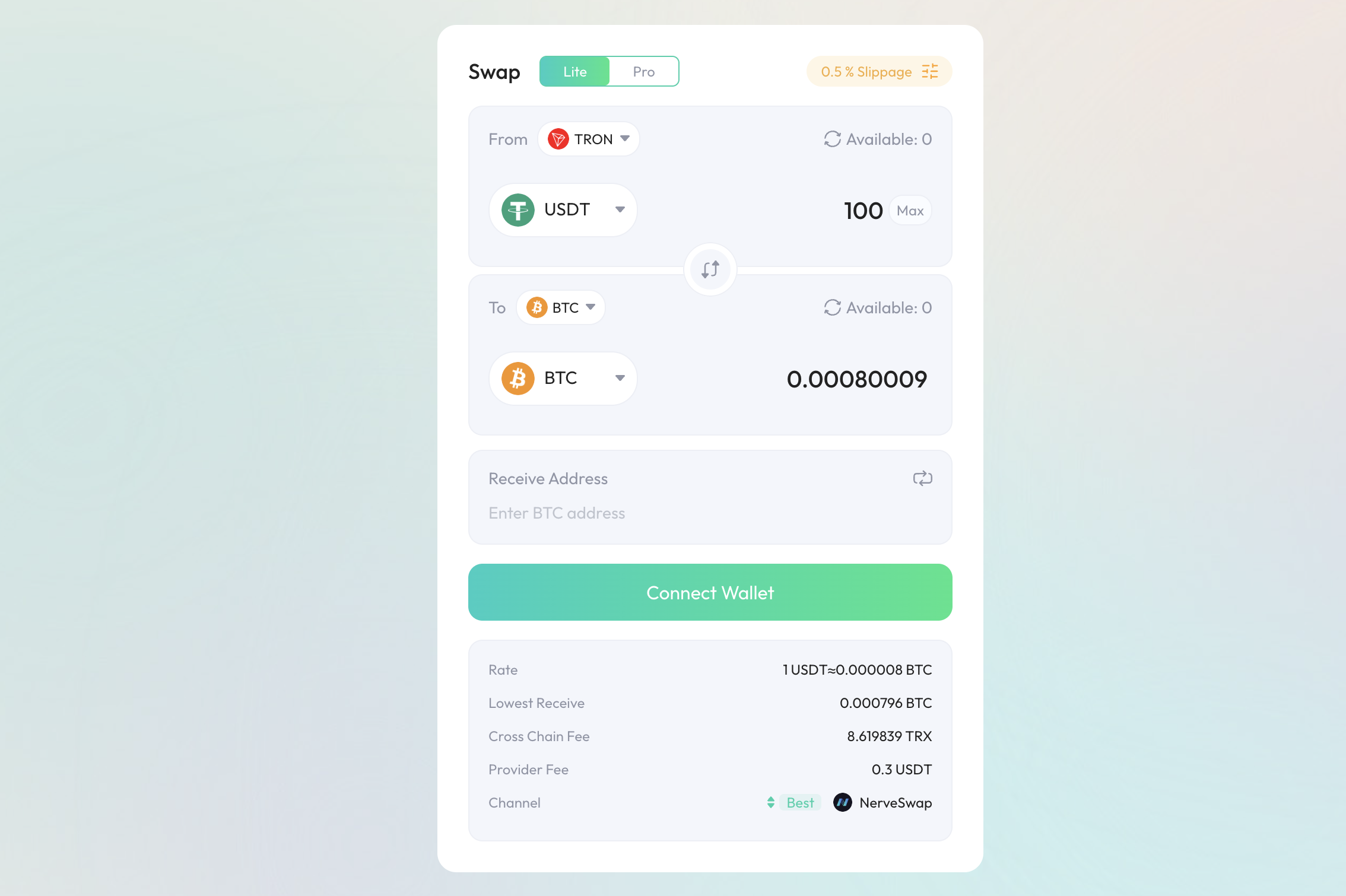 For example: using native BTC to swap USDT (BSC) / USDT (TRON)