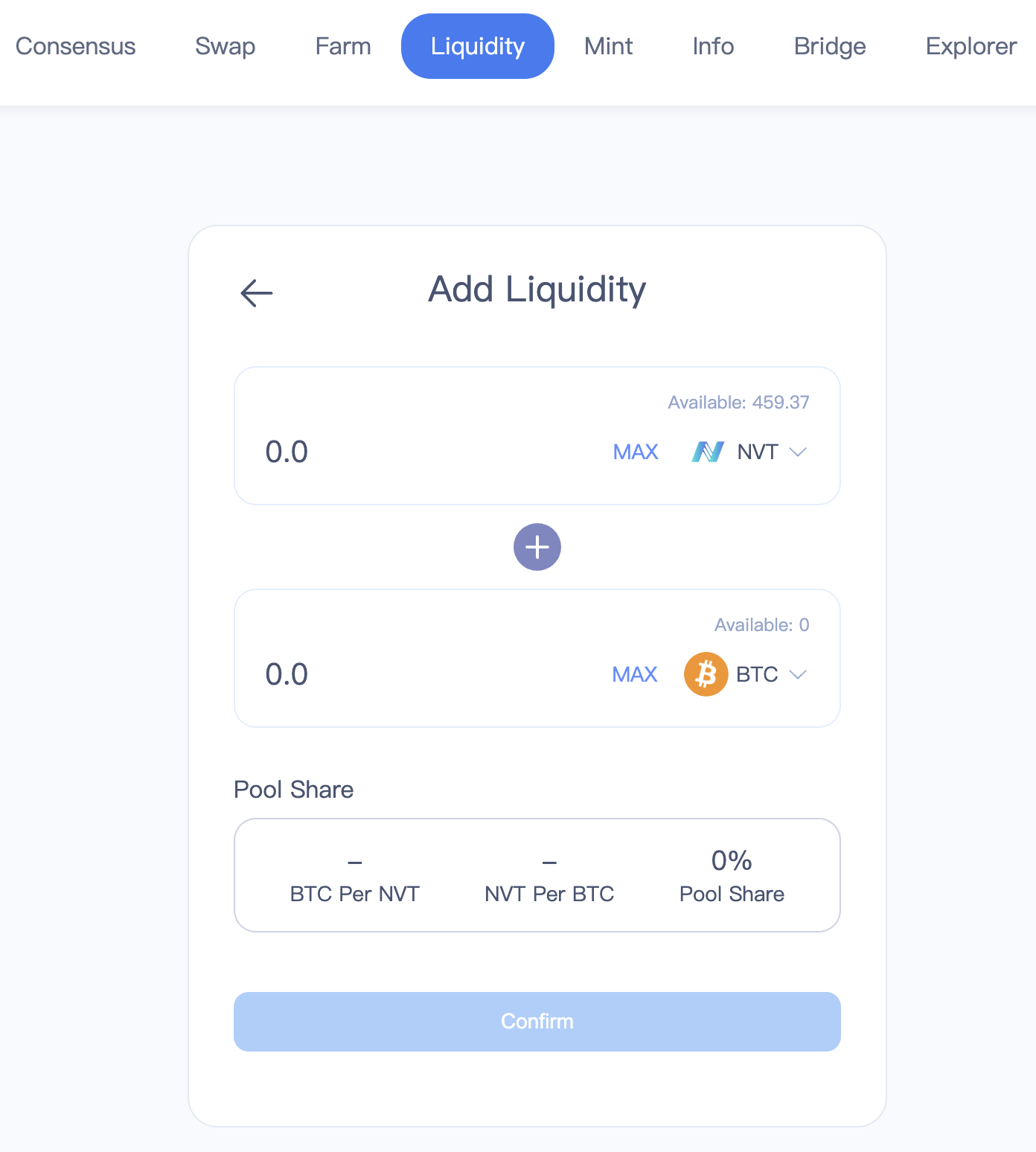 2. Go to the NerveSwap "[Liquidity](https://nerve.network/liquidity)" page, select the asset to which you want to add liquidity, confirm the transaction and sign the transaction to complete.